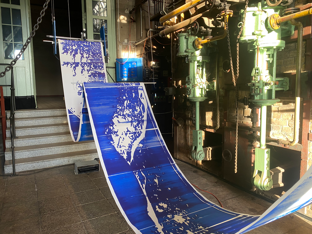 For the exhibition at E-WERK Luckenwalde, Isupova constructed a new vertical drawing machine, transforming the way the maps are presented. Instead of lying flat, the maps cascade downward to the floor as they are generated in real time, allowing audiences to witness mapping as it happens, emphasizing both the fluidity of the landscape and the continuous production of knowledge.